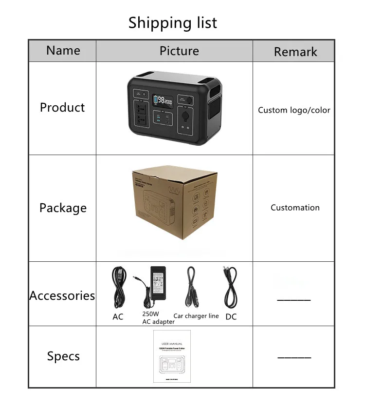 | सामान | एलआरशिपमेंट रिपोर्ट/एसी चार्जर (यूएल) 1x24V 10.42A 250W उच्च शक्ति अनुकूलक 1xAC पावर कॉर्ड 1x सिगरेट लाइटर रूपांतरण लाइन 1xMC4 एडेप्टर केबल 1x मैनुअल |