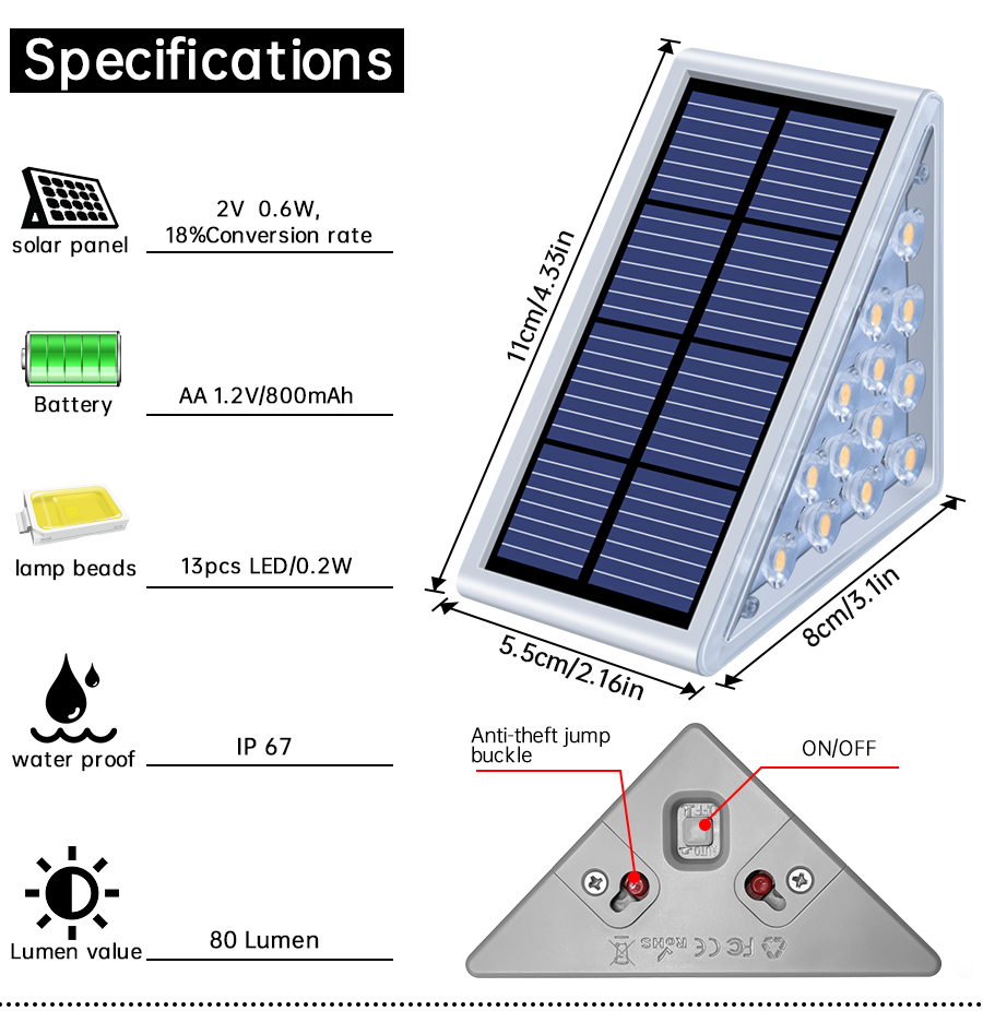 【Upgrade Solar Step Lights】--Provides the right amount of glare-free lighting to guide you in the dark. Upgraded Solar panel Made of Higher Conversion Rate solar panel, it working time much longger than other light in the same sun condition. Built-in rechargeable Ni-MH battery, full-charged can be used for over 8 hours.